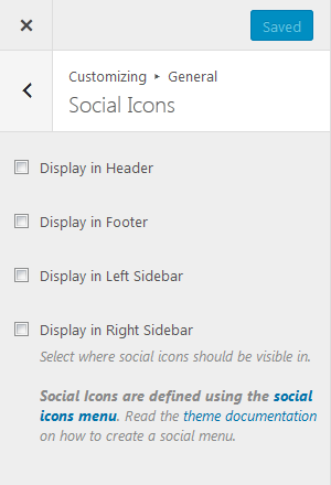 Now that the menu is all set up, navigate to Appearance > Customize > General > Social Icons and select the theme locations you want the social icons to appear in. These areas will be different for each of our themes, the screenshot below applies to Fluida: